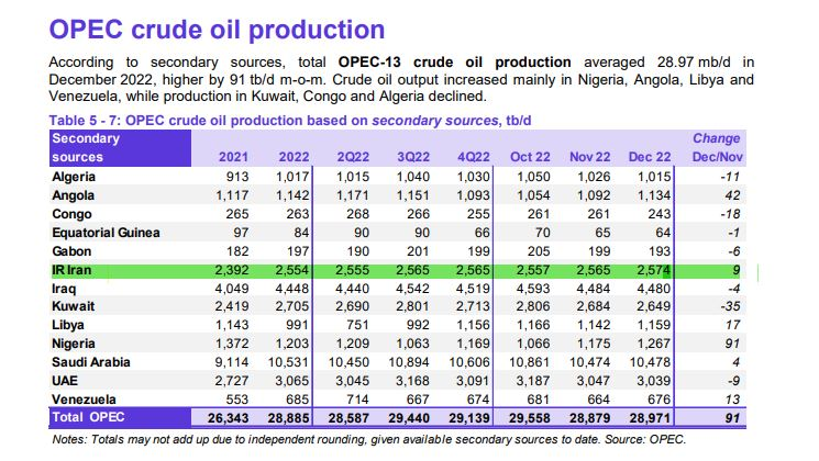 Согласно отчетам ОПЕК, в октябре Иран добыл 2 млн 561 тыс. баррелей нефти в сутки, в сентябре — 2 млн 549 тыс. баррелей нефти в сутки, в августе — 2 млн 571 тыс. баррелей нефти в сутки, в июле — 2 млн. и 567 тысяч баррелей нефти в сутки, в июне 2 миллиона 565 тысяч баррелей в сутки, в мае 2 миллиона 543 тысячи баррелей в сутки и в апреле 2022 года было добыто 2 миллиона 565 тысяч баррелей нефти в сутки.